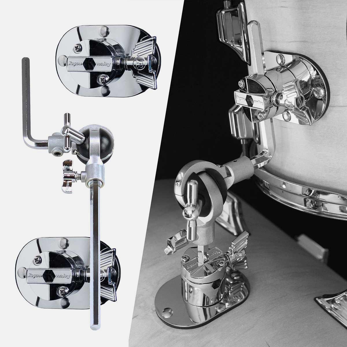 PowerTone Series also features the innovative Ultra-Matic Tom mount, featuring a Hex L-Rod ball joint arm and the new Bi-directional Mounting Brackets complete with original Rogers’ spec Oval Plates. Classic Rogers “Clock Face” styling and a low-profile offer a mounting system that is ultra-adjustable and lightweight, as well as sturdy and dependable.